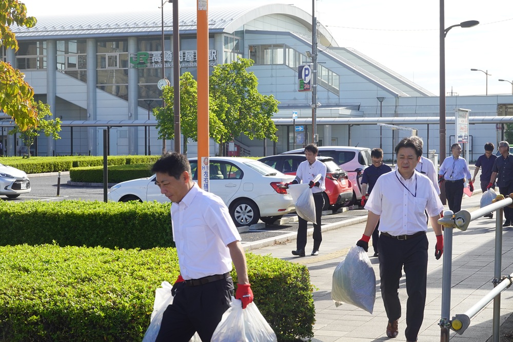ビエント高崎本館前に集合し、参加者全員にゴム手袋とゴミ袋を支給し、必要に応じて鎌や箒等を貸し出した。