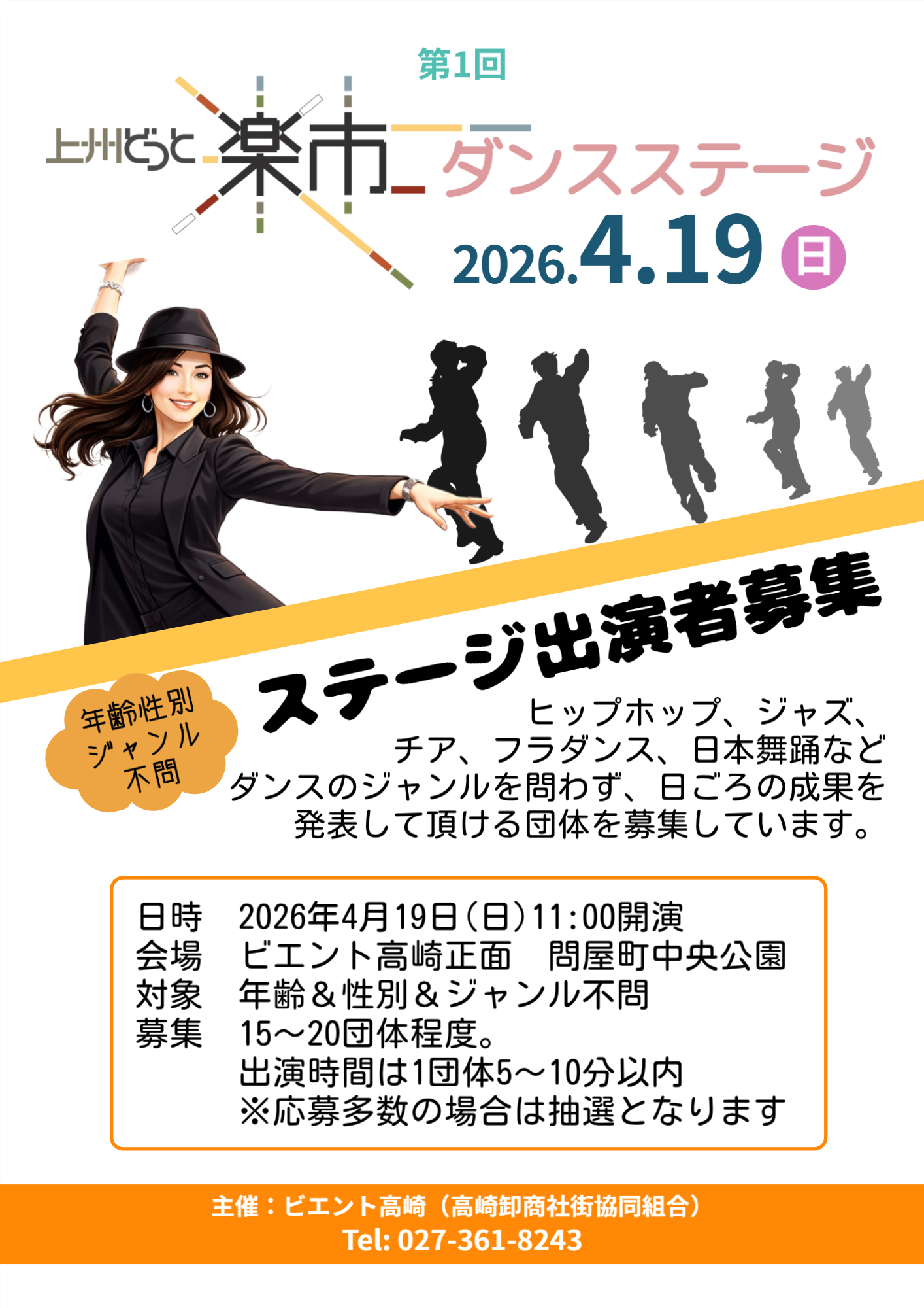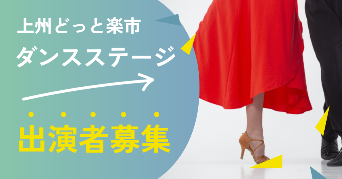 1万人以上が来場するお買い物イベント「上州どっと楽市」でダンスステージを開催いたします。 HipHop、ジャズ、チア、フラダンス、日本舞踊など、ダンスのジャンルは問わず、日ごろの練習の成果を発表していただける団体を募集しています。